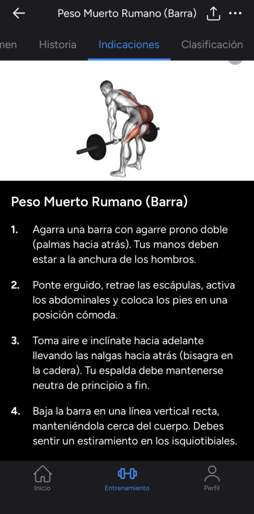 Animaciones y explicaciones detalladas de ejecución de los ejercicios de la rutina