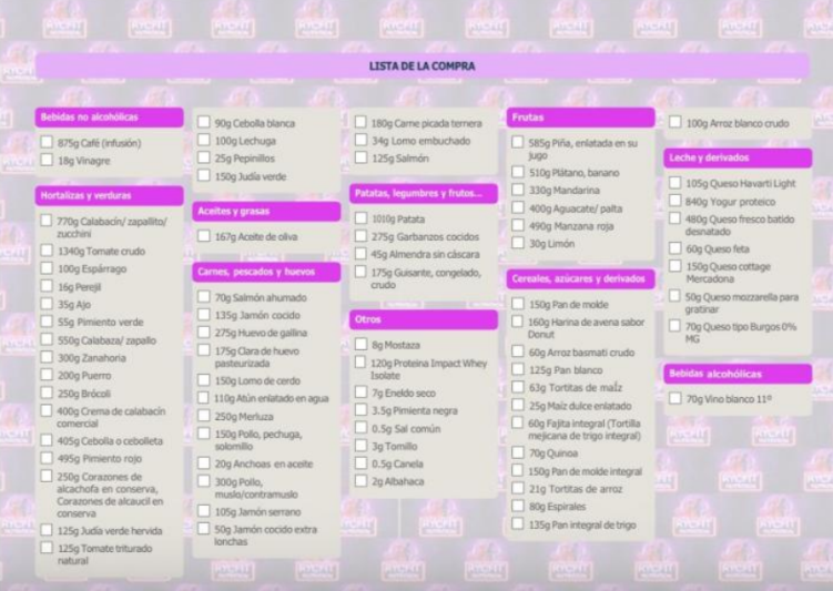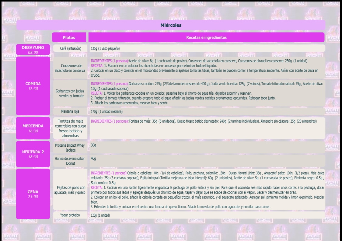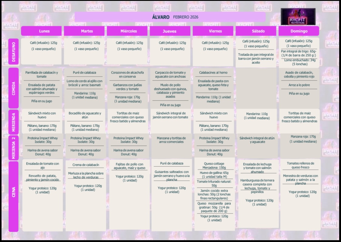 - Cantidades precisas según tu plan semanal.