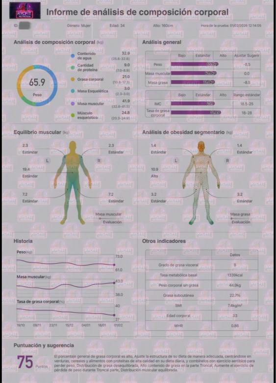 - Se muestra de un solo vistazo la masa corporal, peso y masa muscular que hay que aumentar o disminuir.
